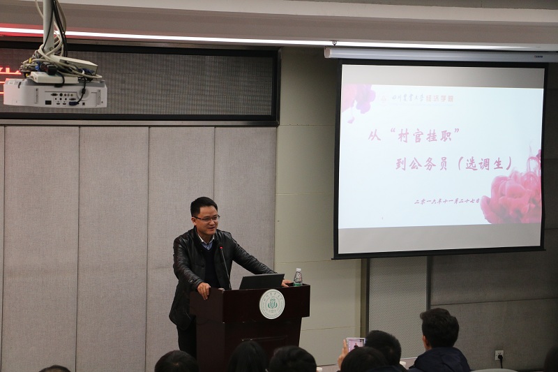 我校农经2005级校友谢亮,也是原经济管理学院第一届“百名大学生‘村官’挂职锻炼”暑期社会实践团队队员,在校期间曾多次参加过“村官挂职”,毕业时也被选拔为四川省选调生,现就职于遂宁市财政局。他结合自身经历,向大家分享了从 “村官挂职”到公务员一路走来的历程,并鼓励大家多走入基层,参与实践锻炼。