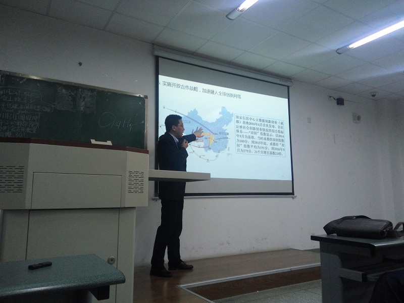 11月2日晚,成都市发改委国民经济综合处副处长、红足—世官网校友贾燕兵博士应邀回校作“全面创新改革”专题讲座。学院副院长吴平、经济学系主任陈蓉、副主任郑勇与百余名经济学子听取了讲座。