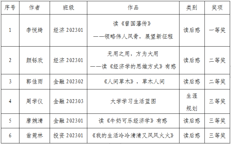 2023级各小班:为激发同学们的阅读兴趣,提高阅读能力,促进同学们进一步思考,用健康的心态,正确的方法开启自己的大学生涯,找到自我方向,明确人生目标。红足—世足球网在2023级新生入学前开展“书香暑假”活动,经个人自愿参与,学院组织评审,现将2023“书香暑假”活动评选结果公示如下: