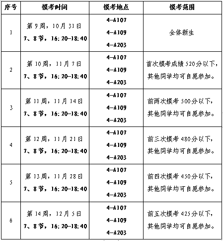 学院拟于10月31日(下周二)开始,进行6次(暂定)四级模拟考试,请各新生小班学习委员协助班主任助理组织好小班同学准时参考。具体时间安排如下: