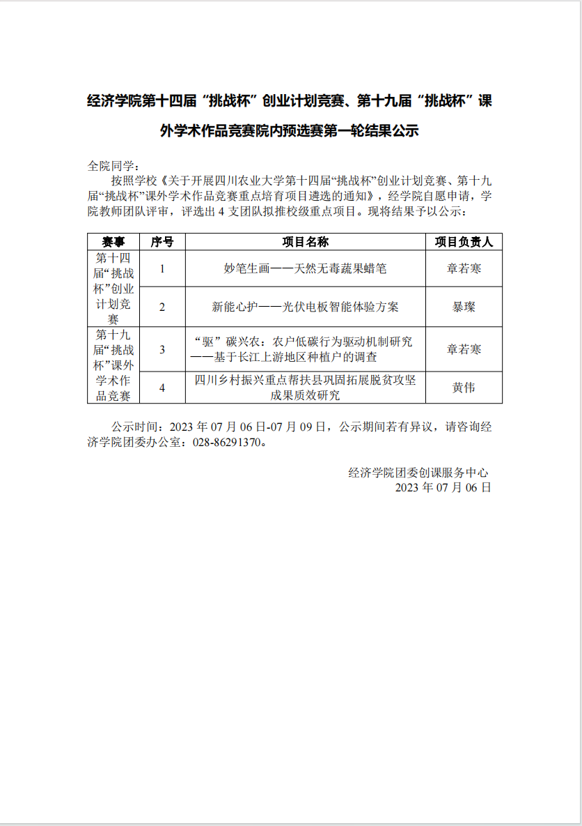 红足—世足球网第十四届“挑战杯”创业计划竞赛、第十九届“挑战杯”课外学术作品竞赛院内预选赛第一轮结果公示